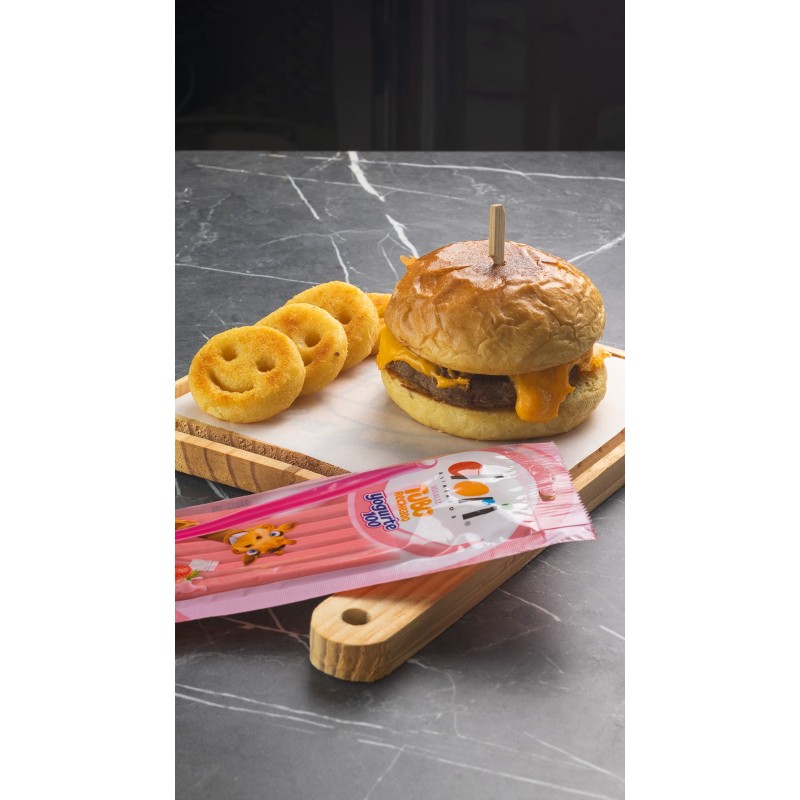 100g de carne (patinho) com queijo mussarela, acompanhado de batata sorriso e fini.